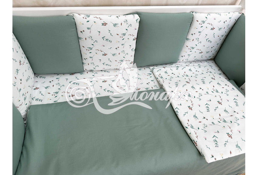 Бортик составной: 12 подушек 31х34 см на замочках упакованы в сумку-переноску.