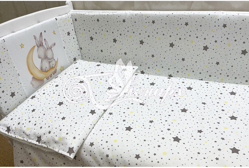 Бортики СО СЪЕМНЫМИ ЧЕХЛАМИ в кроватку: защитят Вашего малыша от ушибов, сквозняков, солнечных лучей и не дадут малышу запутаться в прутьях кроватки. - Простыня на резинке 60х120 см (подходит для стандартной кроватки)